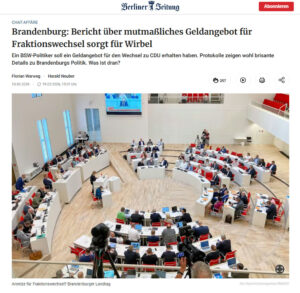- Geldangebot für Fraktionswechsel? Brisante Vorwürfe aus BrandenburgBrisante Vorwürfe aus Brandenburg: Ein Ex-BSW-Abgeordneter soll von einem Geldangebot für einen Fraktionswechsel berichtet haben berichtet die Berliner Zeitung. Interne Chatprotokolle werfen neue Fragen zur Entstehung der heutigen Machtverhältnisse im Landtag auf. Hier den Originalbeitrag lesen.