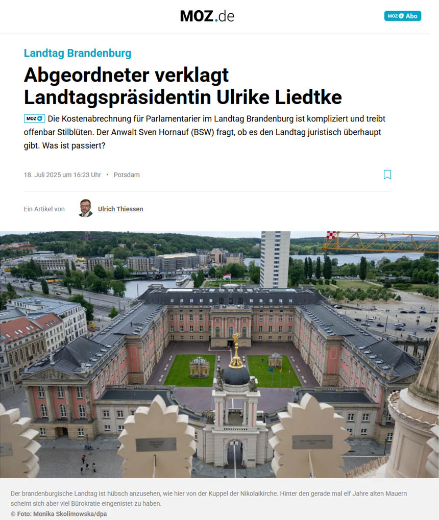 MOZ berichtet: Abgeordneter verklagt Landtagspräsidentin – Hornauf vertritt Fraktionskollegen juristisch